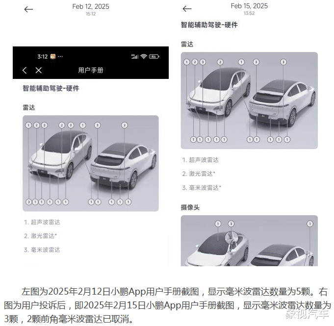 根据《经济参考报》的调查,有车主2024年购买2023款小鹏G6时,获悉车辆配备5颗毫米波雷达,且小鹏App电子用户手册也显示是5颗。然而,车主2025年维修车辆时发现,车辆只有3颗毫米波雷达,该车左前、右前部位少了两颗毫米波雷达。面对车主的质疑,小鹏汽车回应称,技术升级至纯视觉辅助驾驶方案后,相关车型的生产也简化了相应硬件。具体车辆功能配置变化,在公司官网、App等渠道均有同步,不存在隐瞒和欺诈行为。