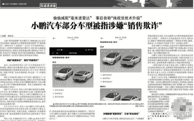 消息一出,舆论一片哗然。后来,小鹏汽车不得不在9月份召回4.7万小鹏P7+,以彻底解决质量问题。日前,《经济参考报》第二次对小鹏汽车出手。12月30日,《经济参考报》发布了一篇名为《小鹏汽车部分车型被指涉嫌“销售欺诈”》的文章。该文章称,小鹏汽车部分车型存在偷偷减配“毫米波雷达”,事后却以“纯视觉技术升级”来搪塞问题,直指其涉嫌虚假宣传与销售欺诈。